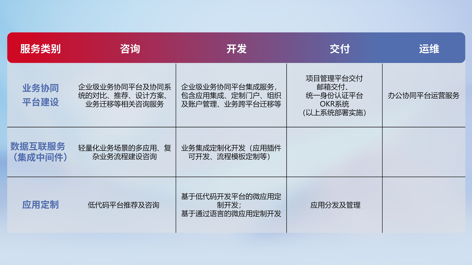 针对钉钉、、、、企微、、、IDaas等平台级产品提供产品的规划、、、、方案、、、、交付、、、定制化开发等服务,,实现如统一协同办公、、智能客户服务、、、、混合会议管理、、智能数据查询、、、、等业务场景,,实现数字化转型。。。。