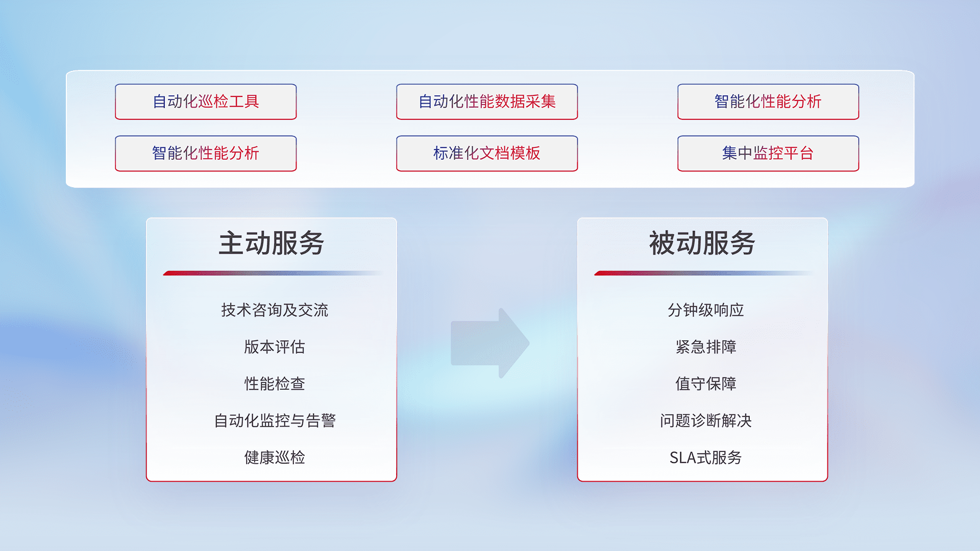智能化工具和标准化文档,,保障服务质量,,,,提供主动服务(包含技术咨询、、、、版本评估、、、、性能检查、、自动化监控与告警、、、、健康巡检)和被动服务包含(分钟级响应、、紧急排障、、、值守保障、、、、问题诊断解决、、、、SLA服务)。。。。