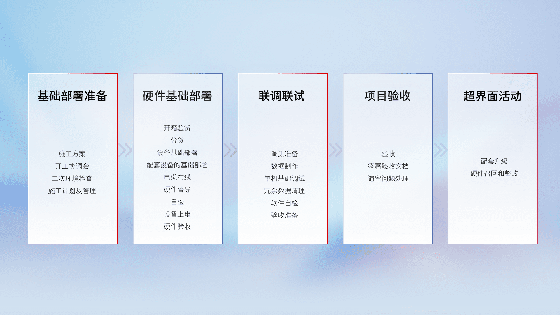 从基础部署准备、、、、硬件基础部署、、、、联调联试、、、、项目验收、、、、越界面活动的全过程可追溯,,,保证施工质量和进度。。。。